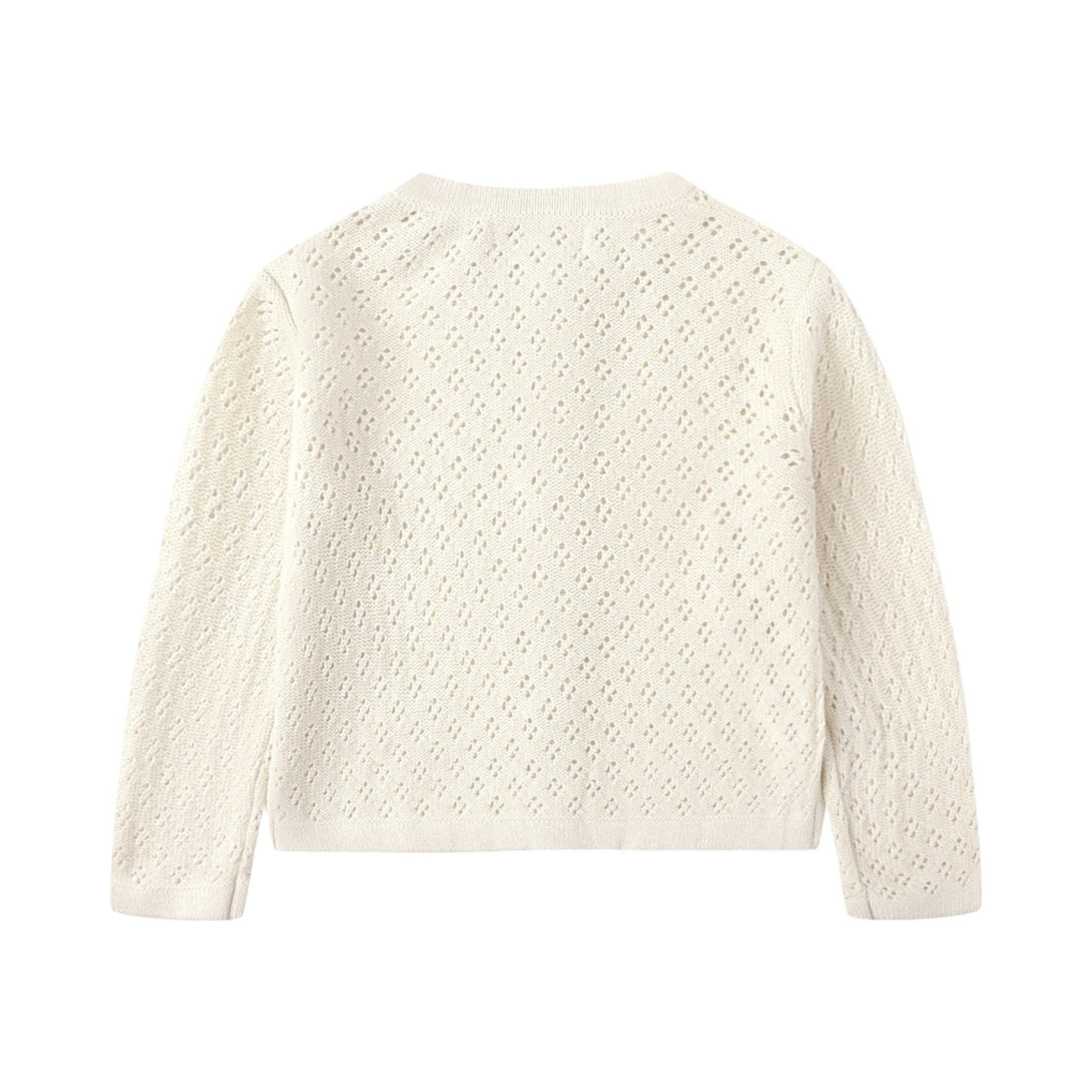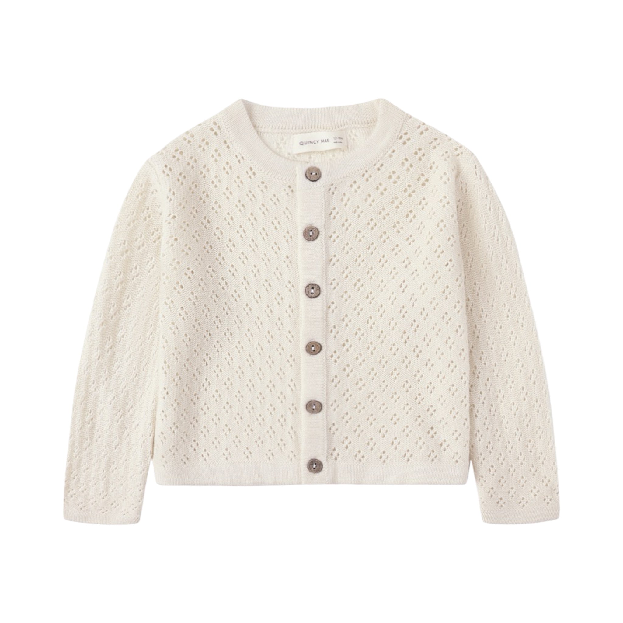 This darling cardigan showcases a beautiful pointelle knit design and coconut buttons for an extra sweet look.
