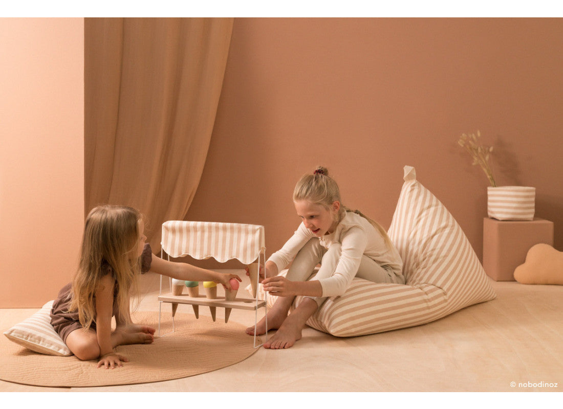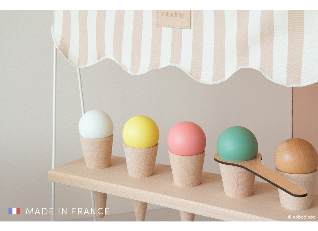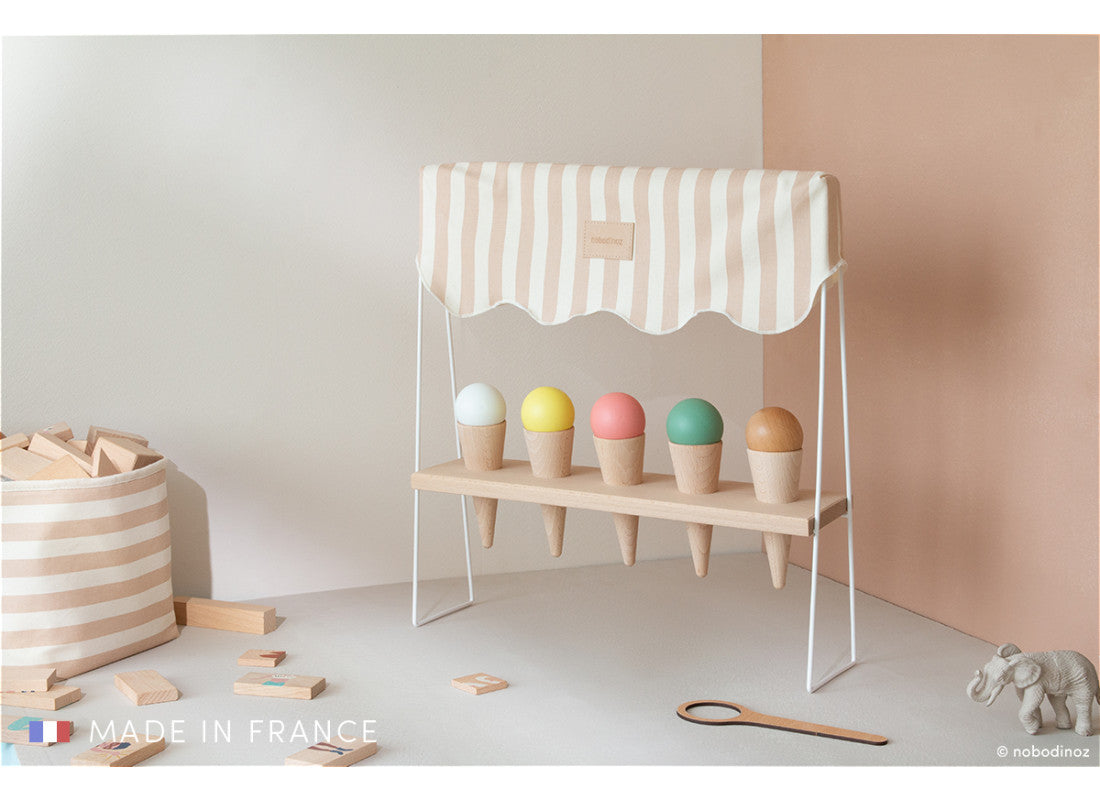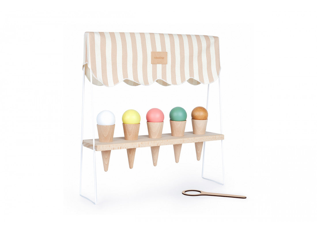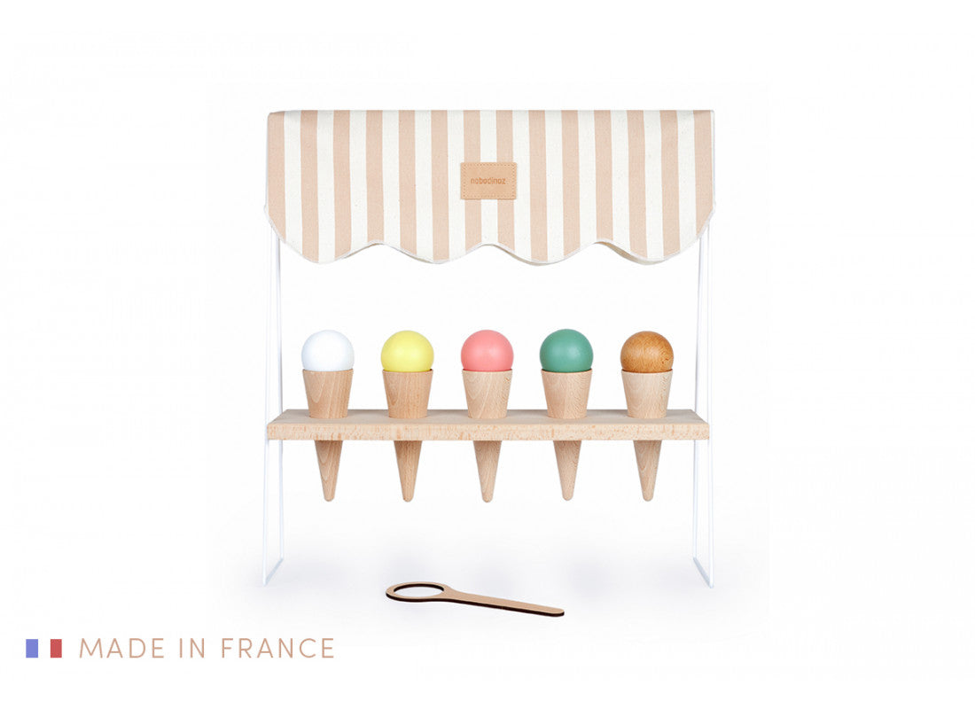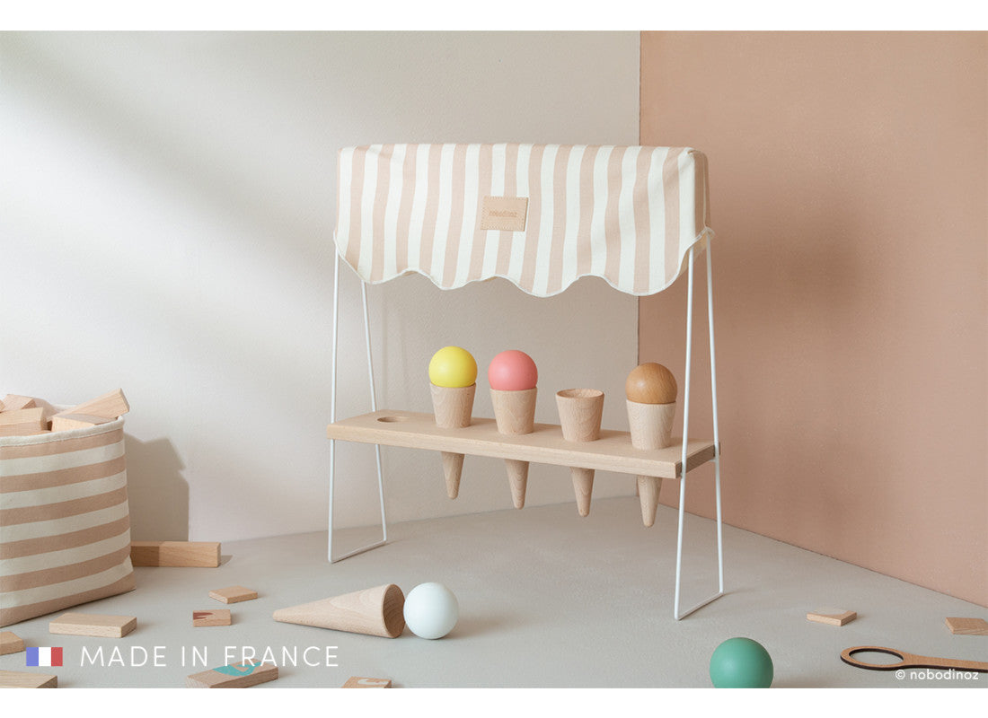 The toy is made of wood with a Taupe striped fabric awning. It comes with five sundaes and a scoop to make it super easy to handle and play with your friends.