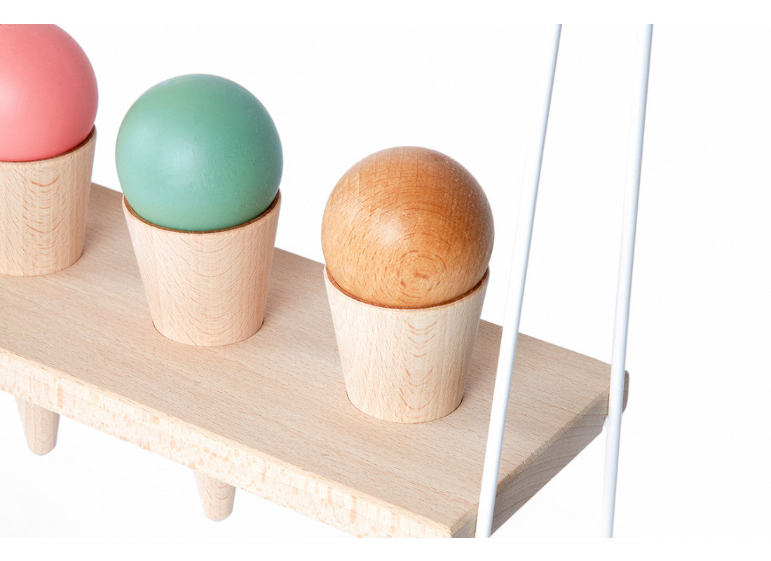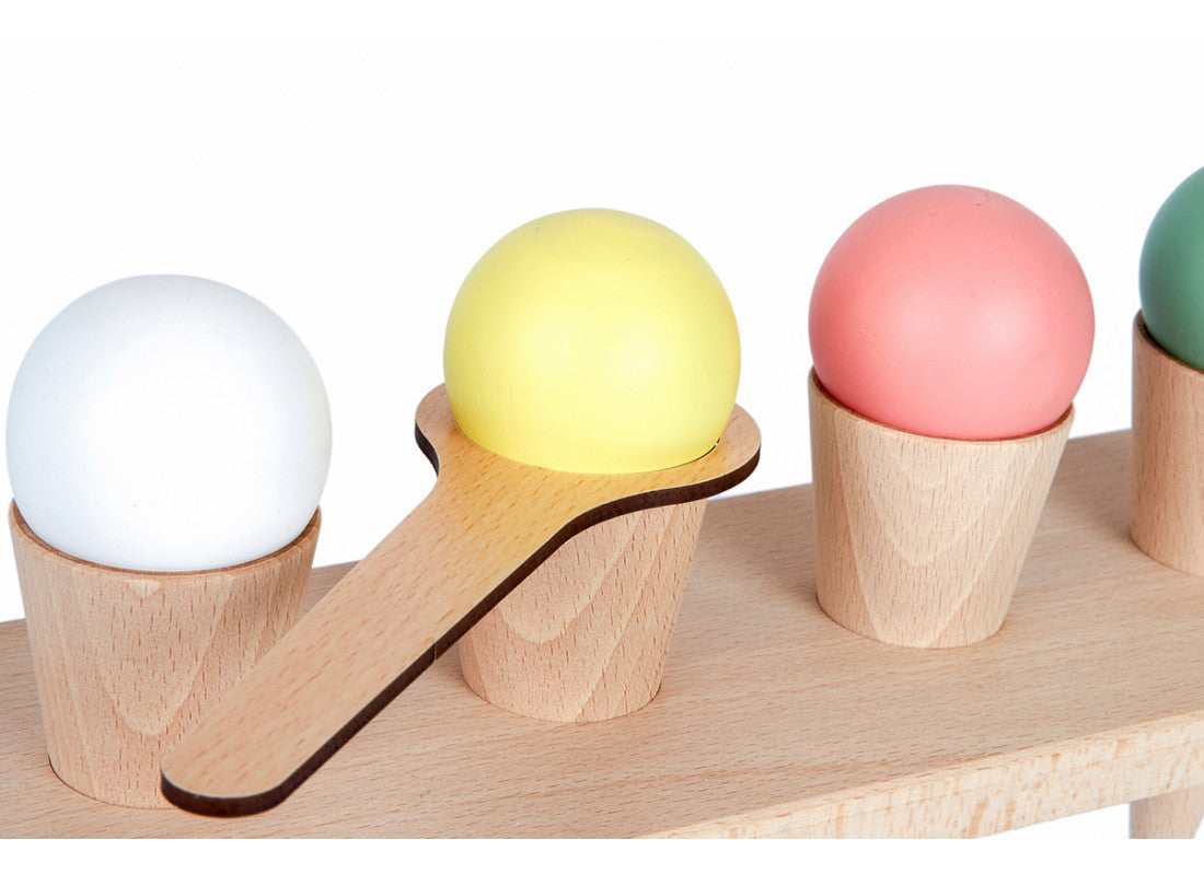- 4 scoops of ice cream painted in yellow, green, pink and white and 1 scoop in natural wood