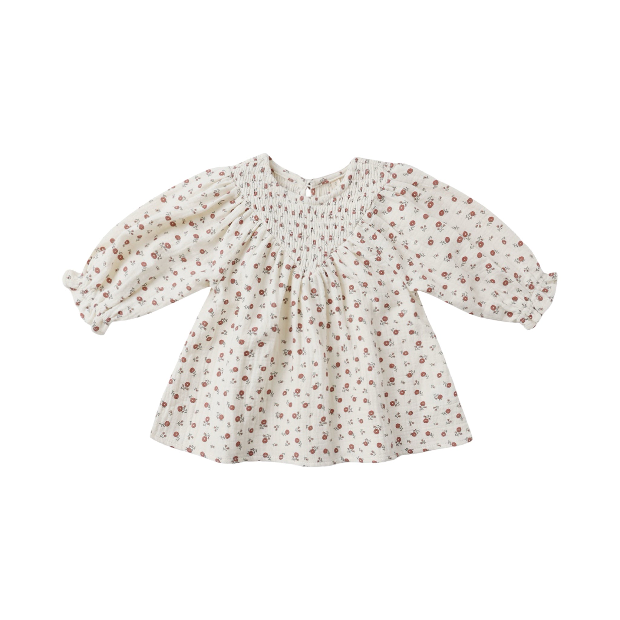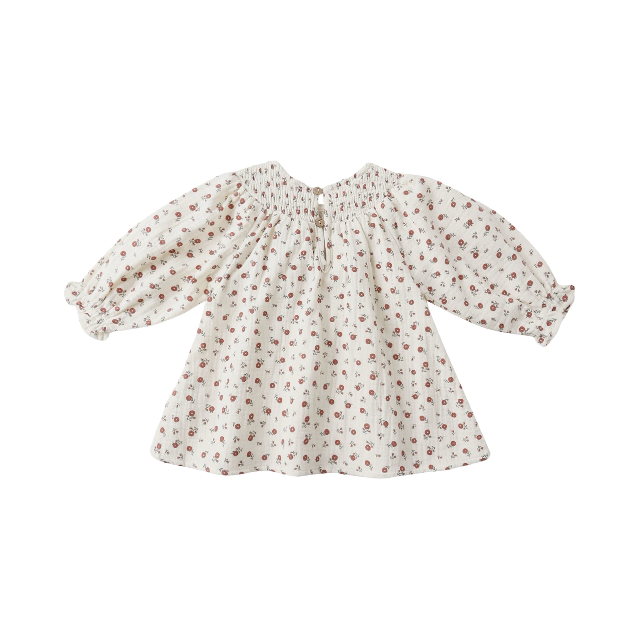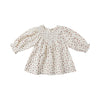This sweet long sleeve dress features a v-shaped smocked neckline, ruffle sleeves, and a button back closure for easy changes. Coordinating bloomers included with all sizes.
